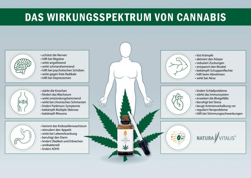 Das Wirkungsspektrum von CBD für Mensch und Tier ist sehr umfangreich, jedoch darf das keinesfalls als Heilaussage gewertet werden. Medizinisches Cannabis wird- wie in der Auflistung aufgeführt-vieleitig eingesetzt.